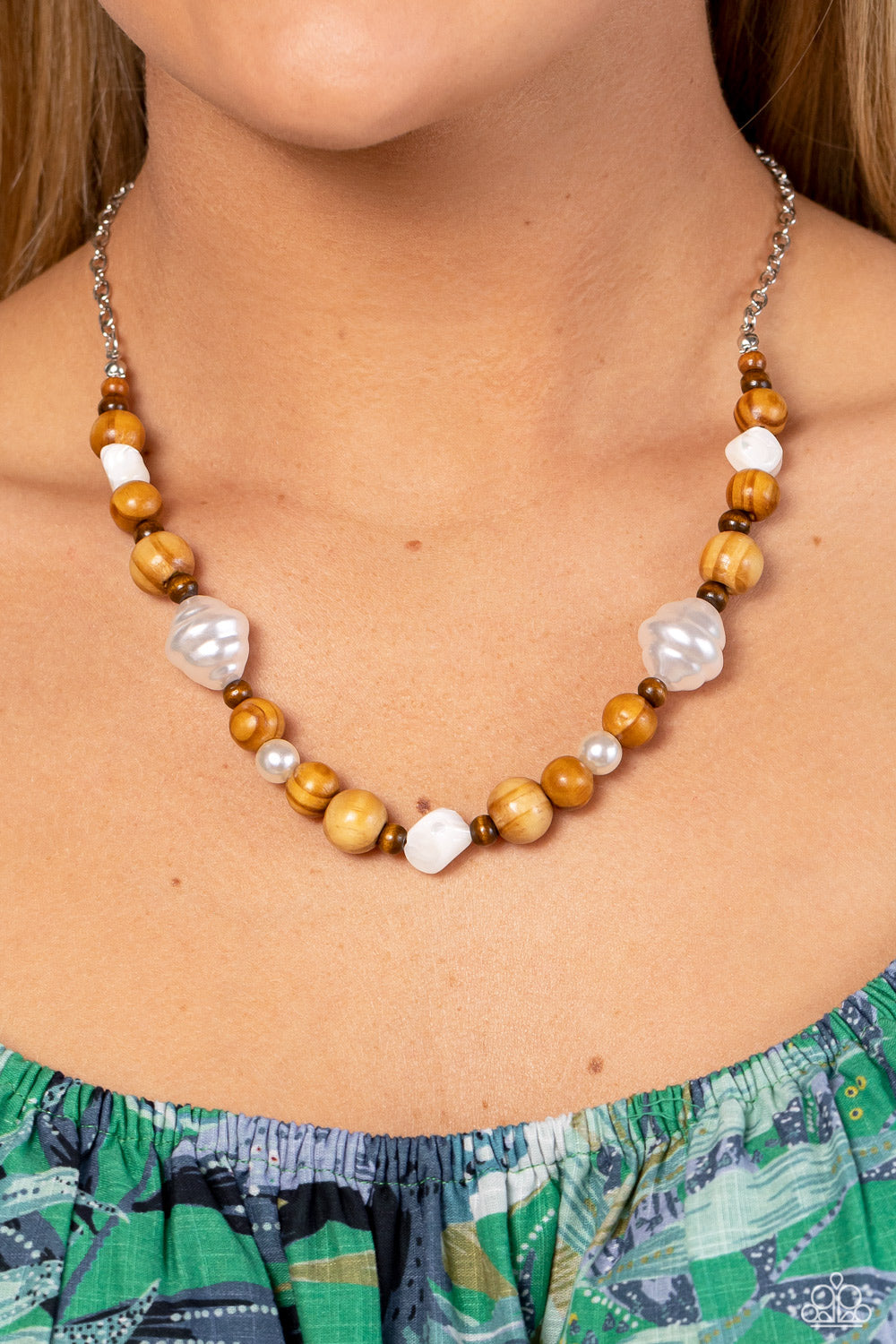 Varying mismatched tan wooden beads and studs alternate with oversized baroque pearly beads and pearly shells along an invisible wire below the collar, creating a bold beach-inspired fashion. Features an adjustable clasp closure.