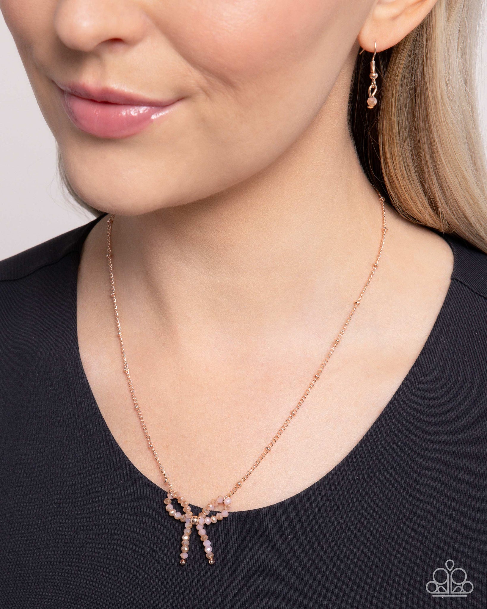 Dipped in a shimmery finish, a collection of peachy and champagne beads loop and curl into a refined bow pendant from a rose gold beaded center. A dainty rose gold satellite chain connects to the bow charm for additional feminine detail. Features an adjustable clasp closure.