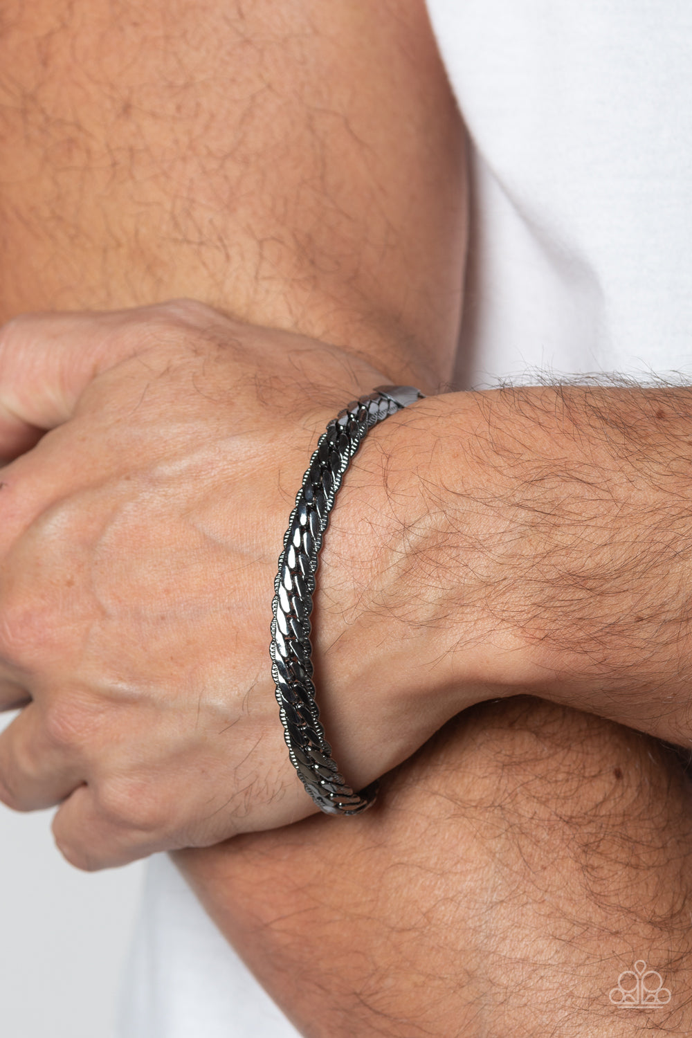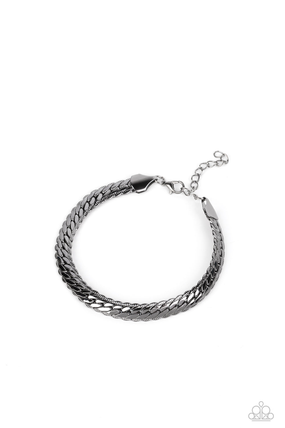 Brushed in a high-sheen finish, a thick, gunmetal chain wraps around the wrist for an industrial look. Featured within the design, the chain seems to tightly stack on top of itself, emitting light from every angled layer. Features an adjustable clasp closure.
