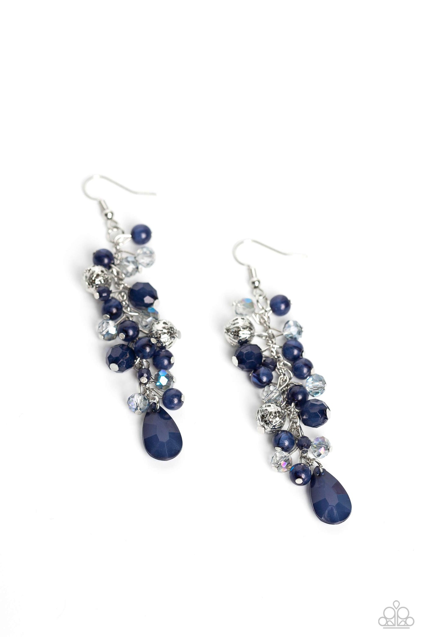 A dainty collection of blue teardrop and round beads, textured silver accents, and faceted blue crystal-like beads trickle from a single strand of silver chain, resulting in a cheekily clustered chandelier. Earring attaches to a standard fishhook fitting.
