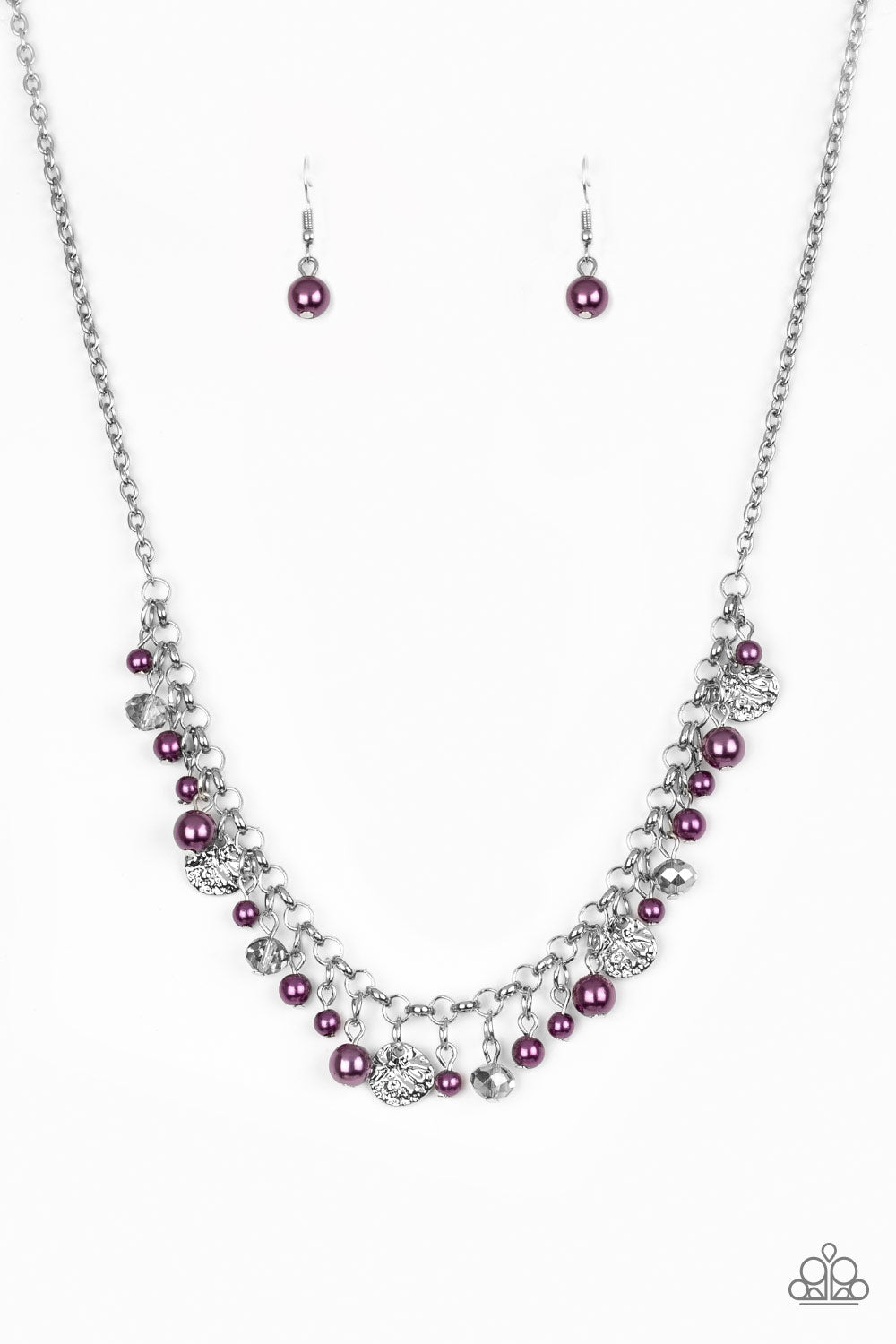 Pearly purple beads, smoky crystal-like gems, and hammered silver discs swing from a bold silver chain, creating a refined fringe below the collar. Features an adjustable clasp closure.