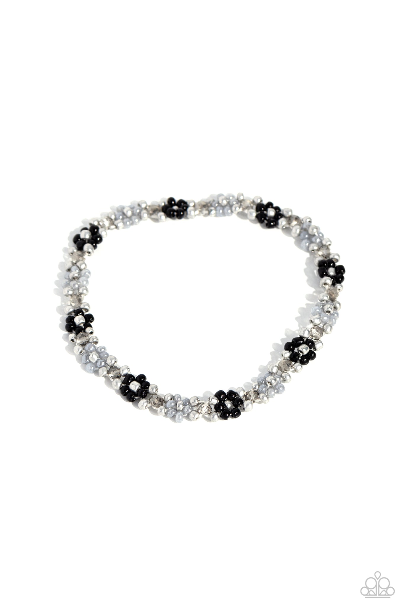 Infused along an elastic stretchy band, a collection of black and gray seed bead flowers with silver seed bead centers delicately braid around the wrist. Additional silver seed beads and dainty reflective smoky bead accents are interspersed throughout the strand for a whimsical finish.