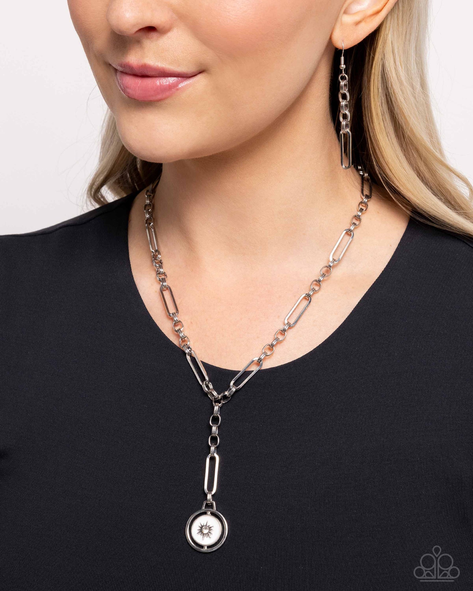 Doubled collections of silver rings connect to elongated silver paperclip chain links as they extend below the collar in a y-shaped arrangement. Featuring a white rhinestone center, a three-dimensional dainty silver star rests atop a white shell pressed in a silver frame that effortlessly spins inside a larger silver circle frame, threaded along a dainty silver rod, extending from the center of the design for a cosmically coastal finish. Features an adjustable clasp closure.