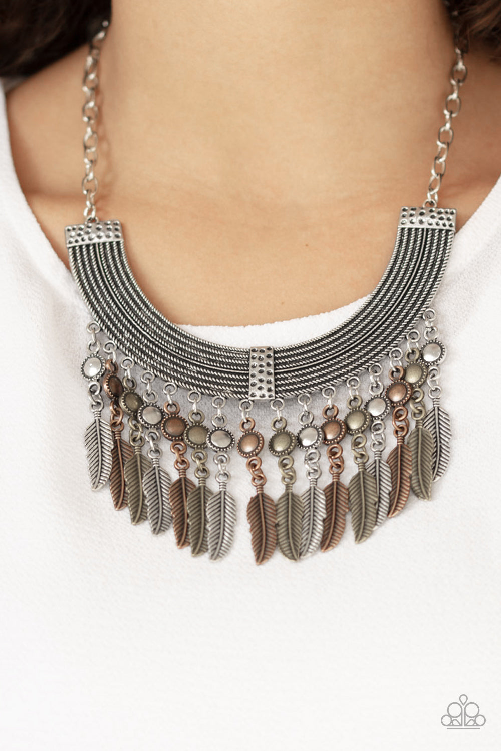 Shimmery silver, copper, and brass feather charms dangle from the bottom of a bowing silver frame, creating a ferocious fringe below the collar. Features an adjustable clasp closure.
