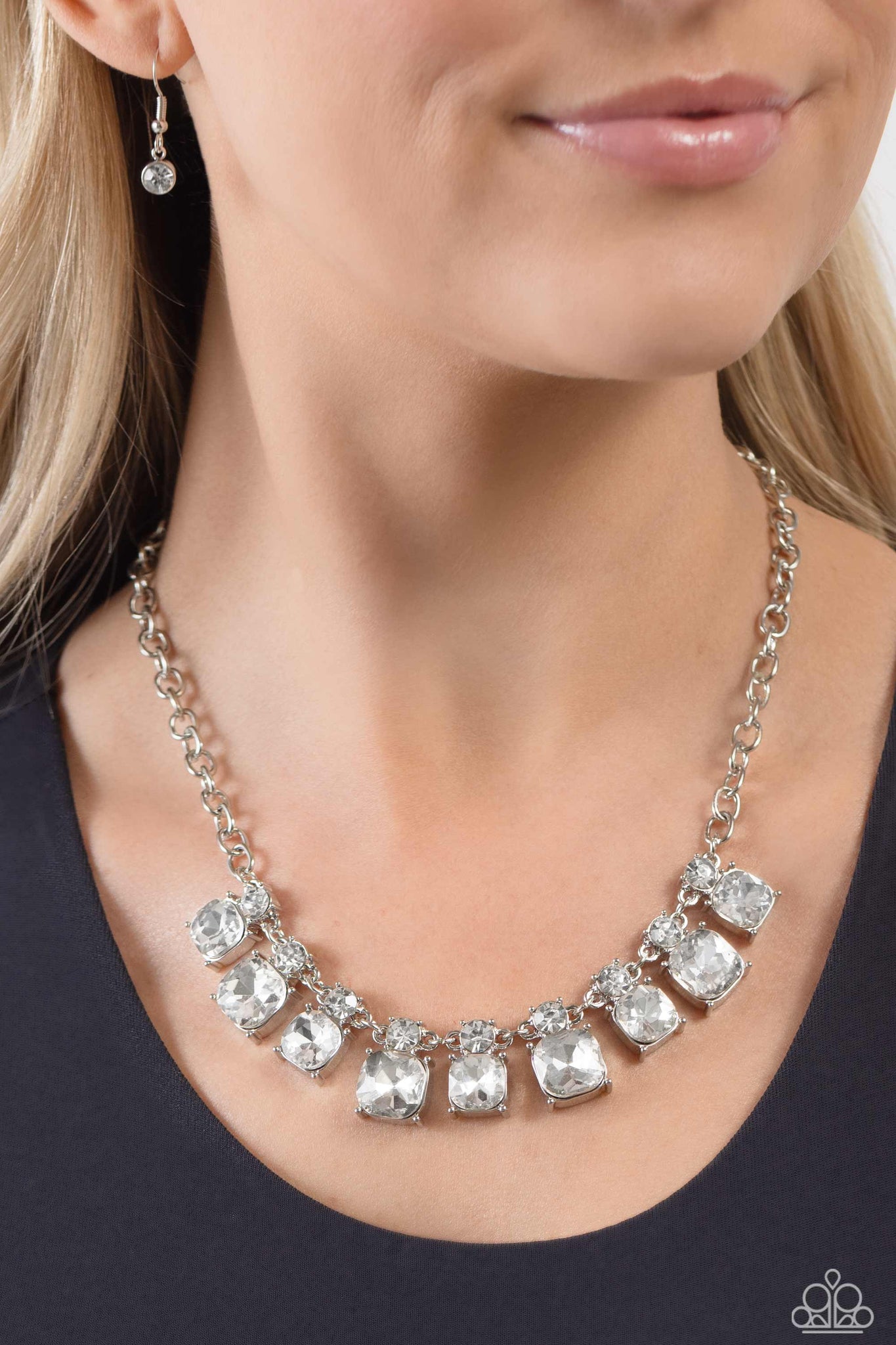 Infused along a silver link chain, faceted white gems, in thick silver fittings, alternate in size below the collar. Dainty white gems kiss the tops of the bigger gems for additional light-catching shimmer and shine. Features an adjustable clasp closure.