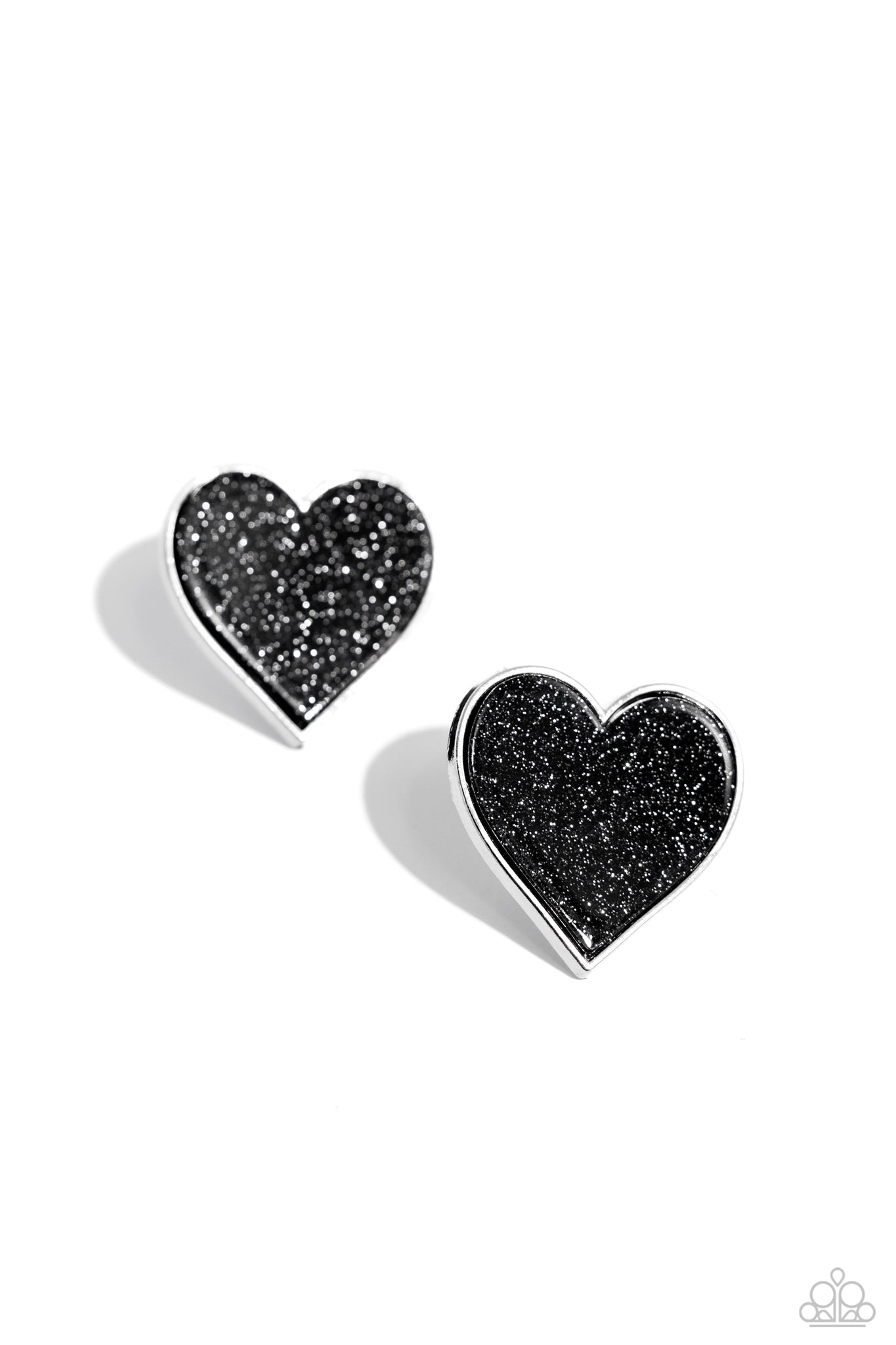 Dusted in sparkles, black hearts, pressed in sleek silver frames neatly sparkle atop the lobes for a flirtatious centerpiece. Earring attaches to a standard post fitting.