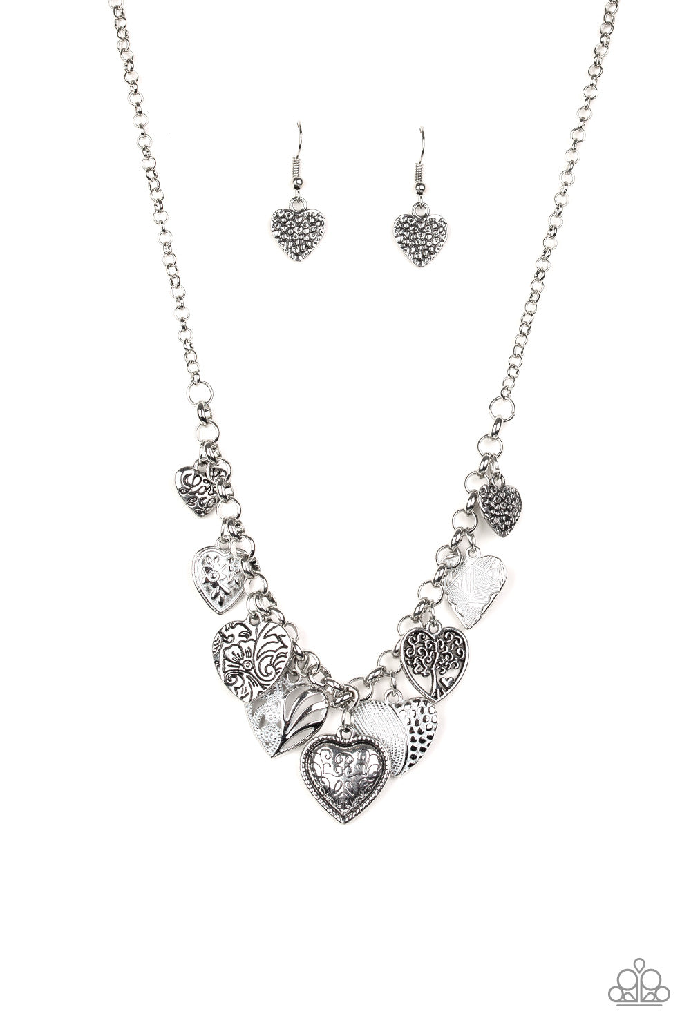 Featuring an array of floral patterns, a collection of silver hearts swing from the bottom of a shimmery silver chain. Alternating charms are brushed in a shiny white finish, creating a colorful fringe below the collar. Features an adjustable clasp closure.