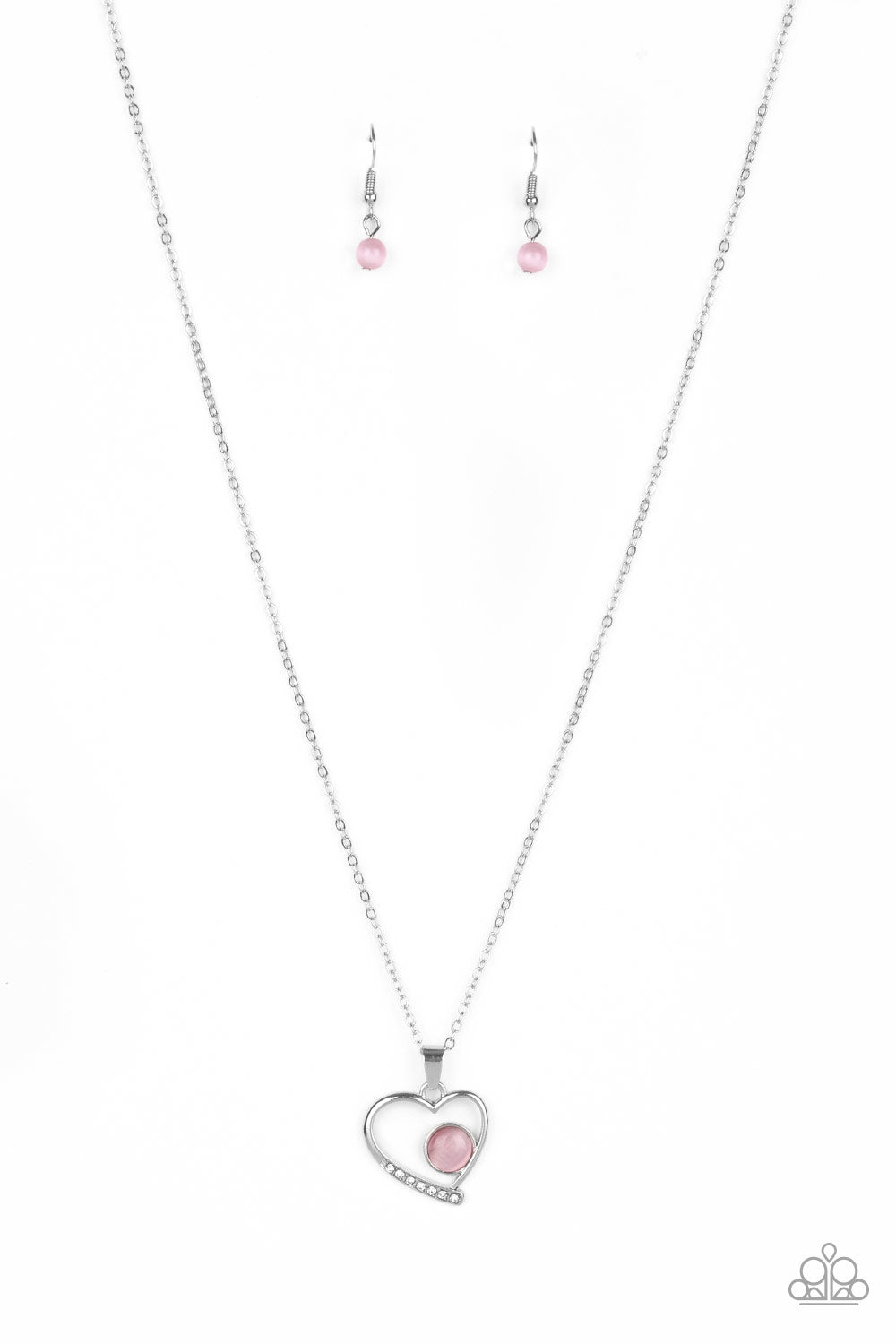 A dainty pink cat's eye stone is nestled inside of a silver heart frame. The bottom of the pendant is encrusted in a section of glassy white rhinestones, creating a romantic pendant below the collar. Features an adjustable clasp closure.