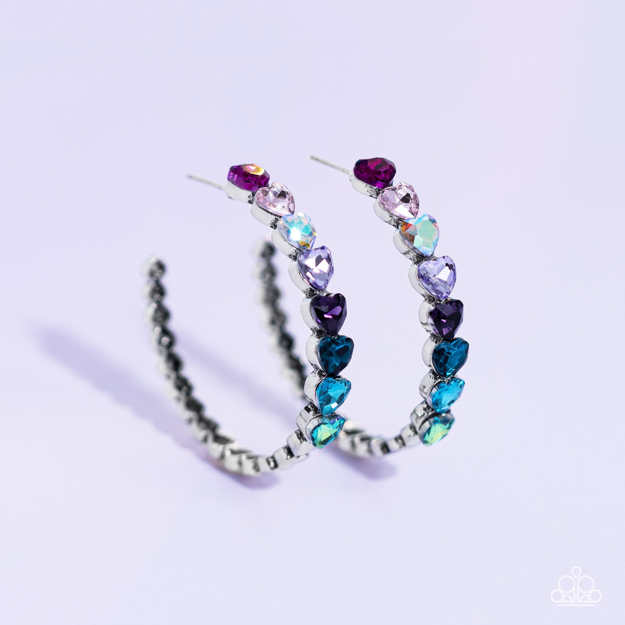 Featuring a scalloped heart frame, glittery heart rhinestones in shades of pink, iridescence, purple, blue, and a refracted green shimmer slowly decrease in size as they curve down the ear to meet dainty silver hearts for a romantic statement. Earring attaches to a standard post fitting. Hoop measures approximately 1 3/4" in diameter. Due to its prismatic palette, color may vary.