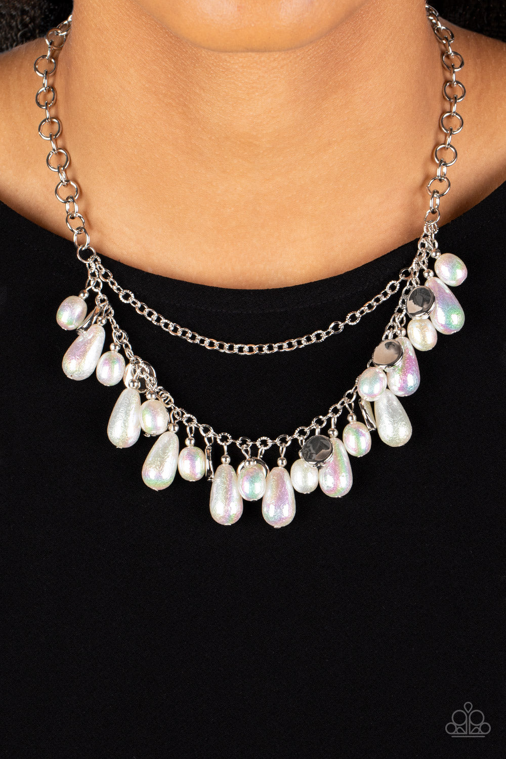 Featuring an iridescent foil-like finish, pearly white oval and teardrop beads alternate with shiny silver discs below the collar. A dainty silver chain is draped above the stellar beading, resulting in enchanting layers. Features an adjustable clasp closure. Due to its prismatic palette, color may vary.